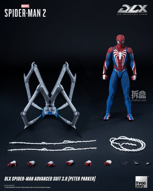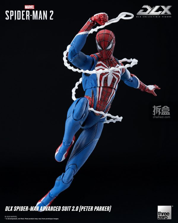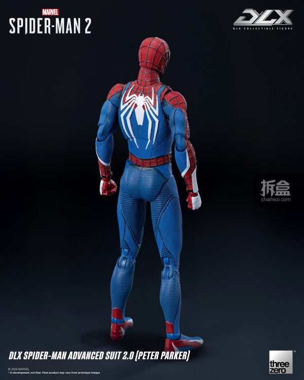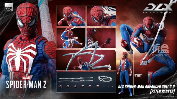 DLX 蜘蛛侠高级战衣2.0(彼得·帕克)身高约15.5厘米,采用threezero独特设计的合金配搭工程塑料骨架,具备约39个可动关节;部分关节部件采用合金制成,拥有高可动及耐用度。人偶身上带有饱满而立体的肌肉线条,贴身衣亦雕刻有不同的布纹,呈现游戏中丰富的布纹材质。红蓝配色的战衣辅以黑色网格纹路,胸口和背上的巨大白色蛛纹亦得以重现,细腻还原《漫威蜘蛛侠2》中的形象外观。